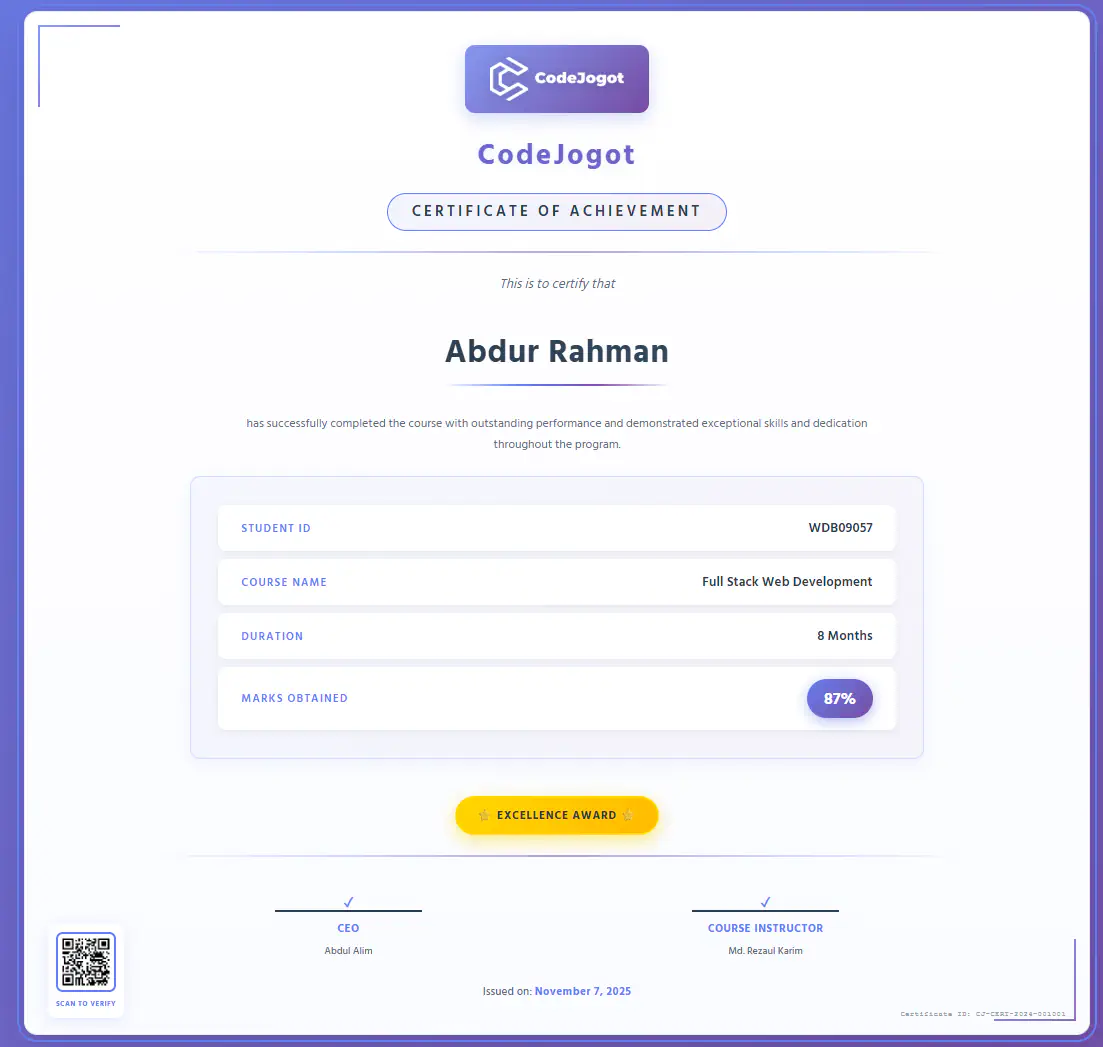 কোডজগতের সঙ্গে আমার অভিজ্ঞতা অত্যন্ত সুন্দর ছিল । তাদের One to One সাপোর্ট সত্যিই অসাধারণ এবং এটা অন্য কোথাও পাওয়া যায় না।